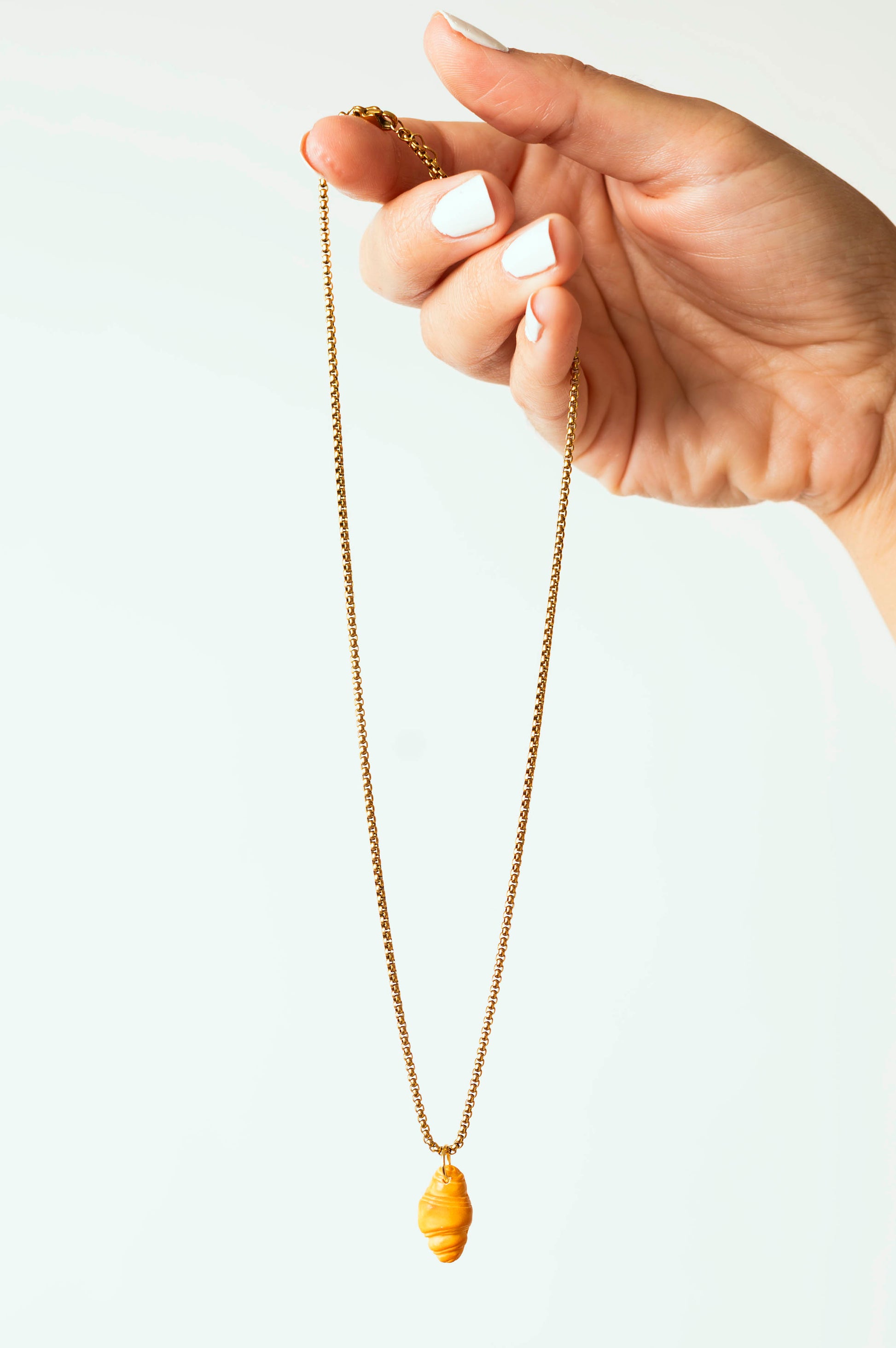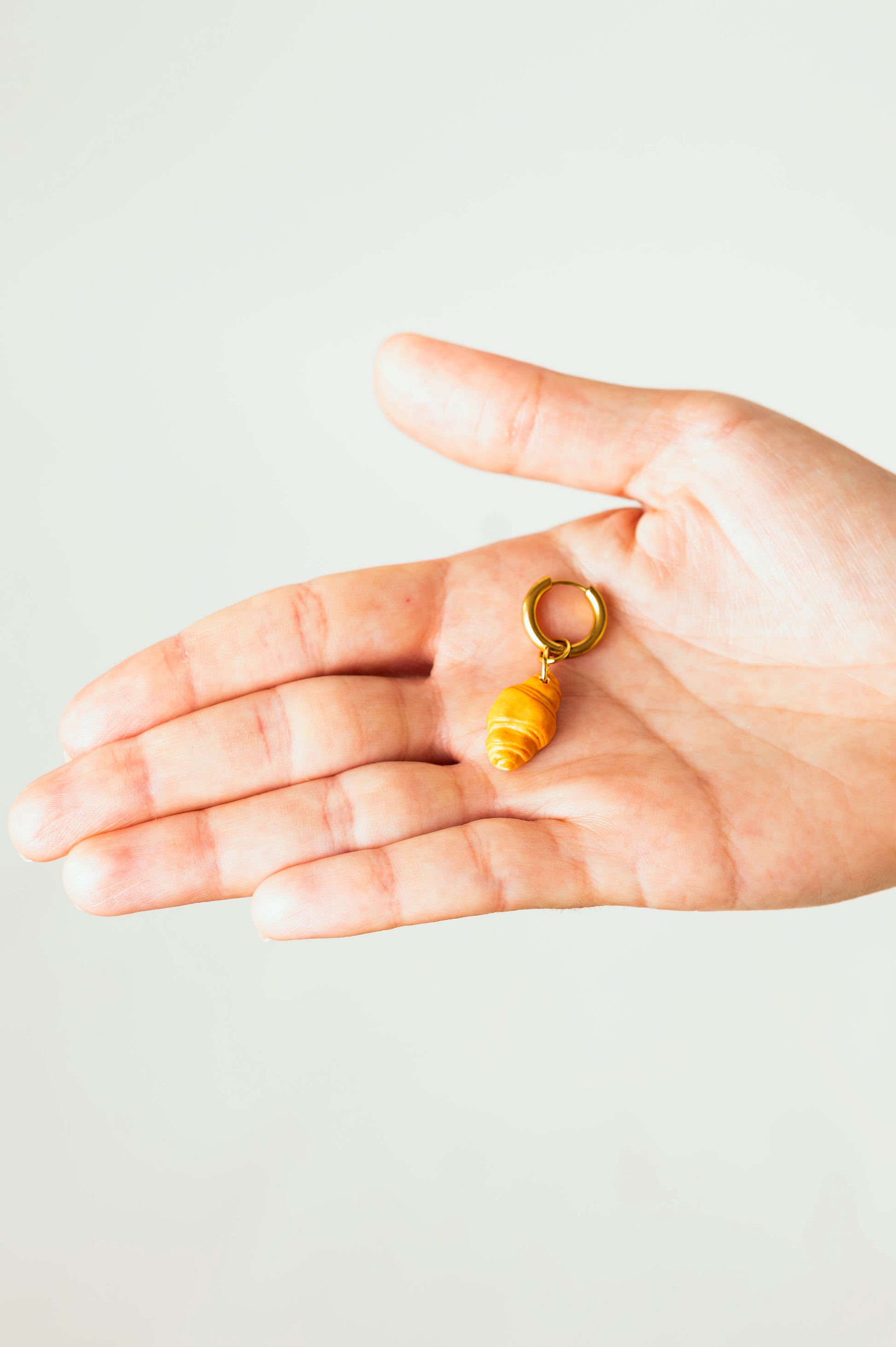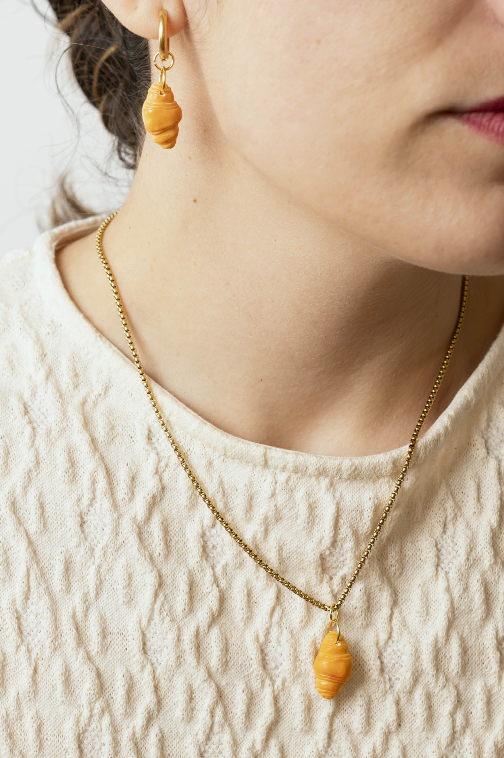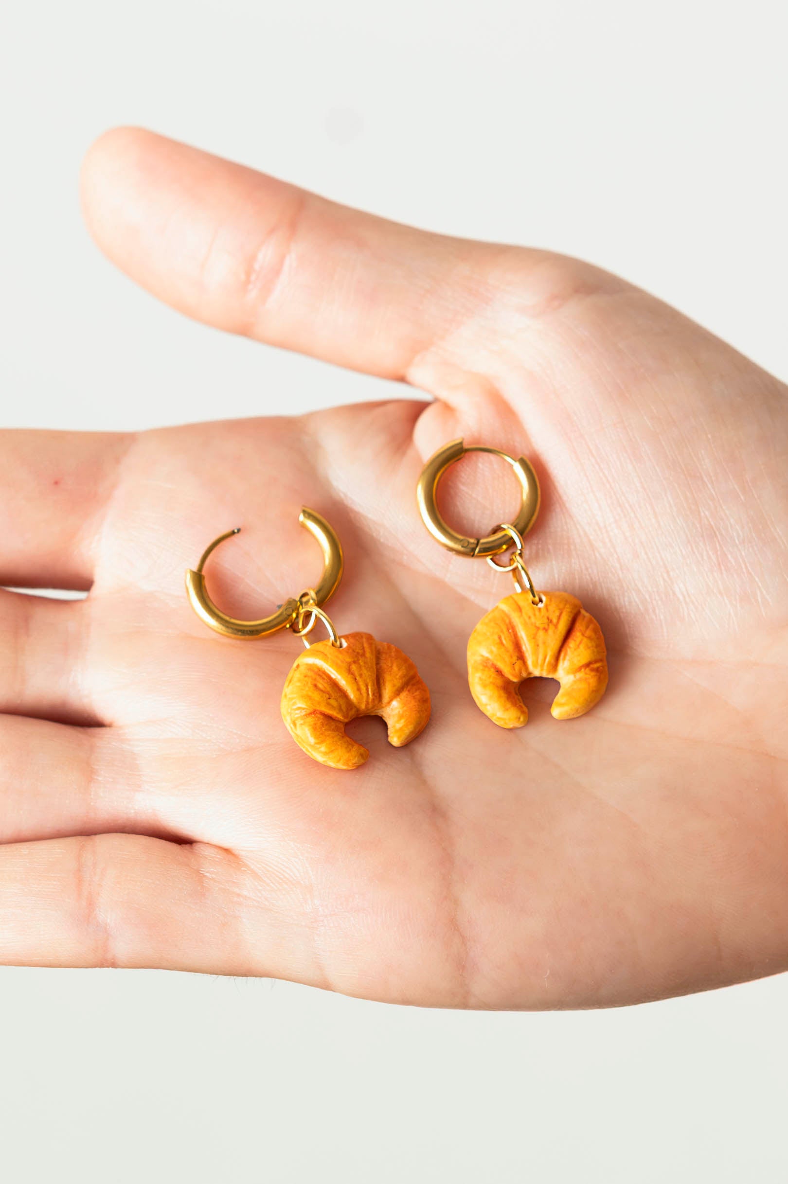 Estos pendientes y colgantes con forma de croissant están hechos a mano con arcilla polimérica, cuidando cada detalle para que parezcan recién salidos del horno. Son ligeros, alegres y un pequeño guiño a los placeres sencillos de la vida.