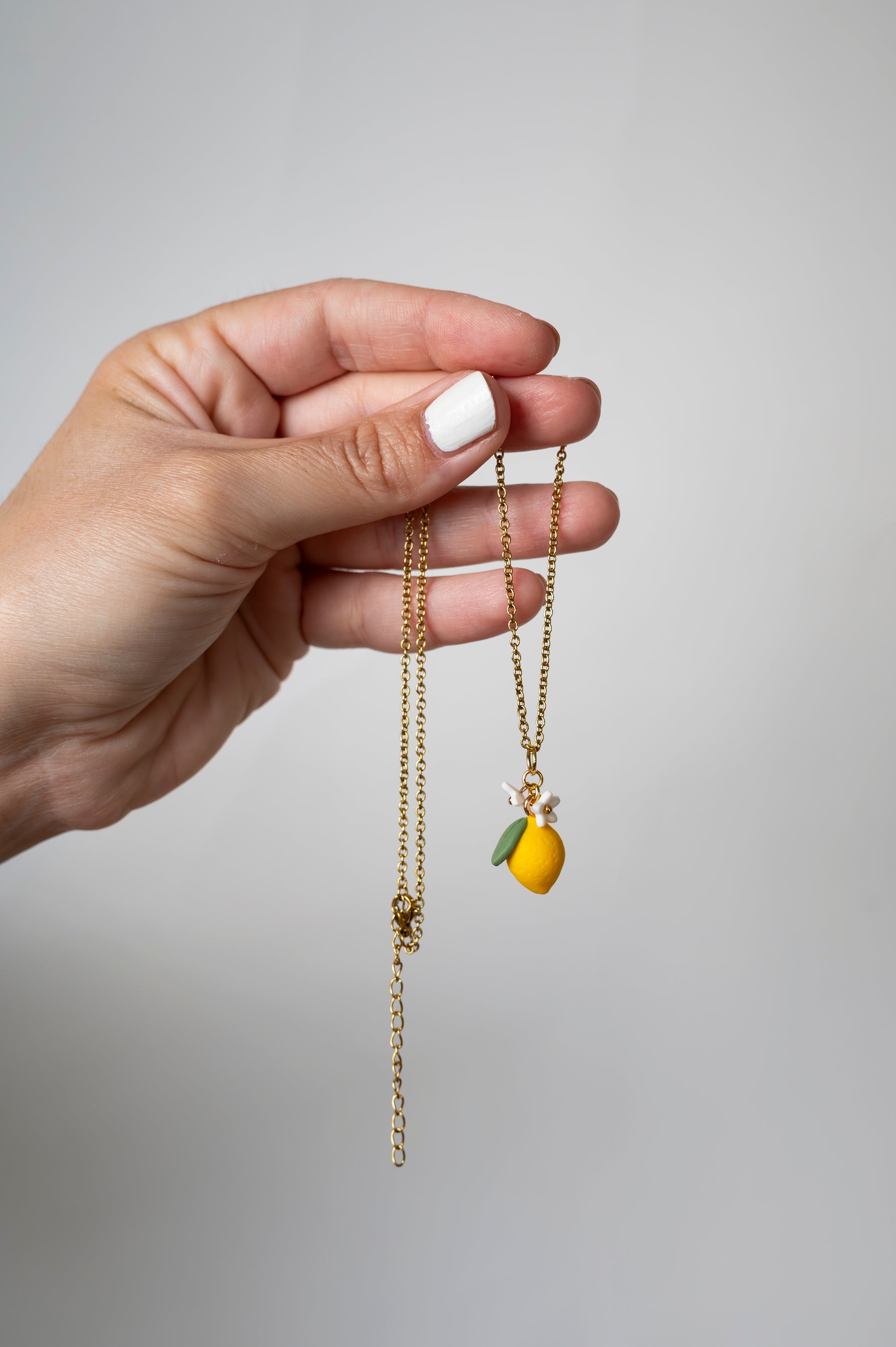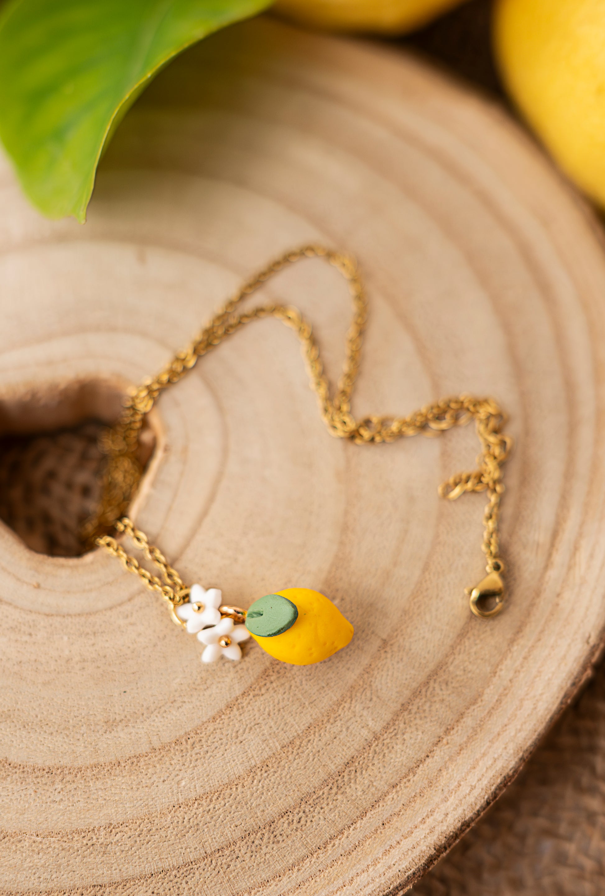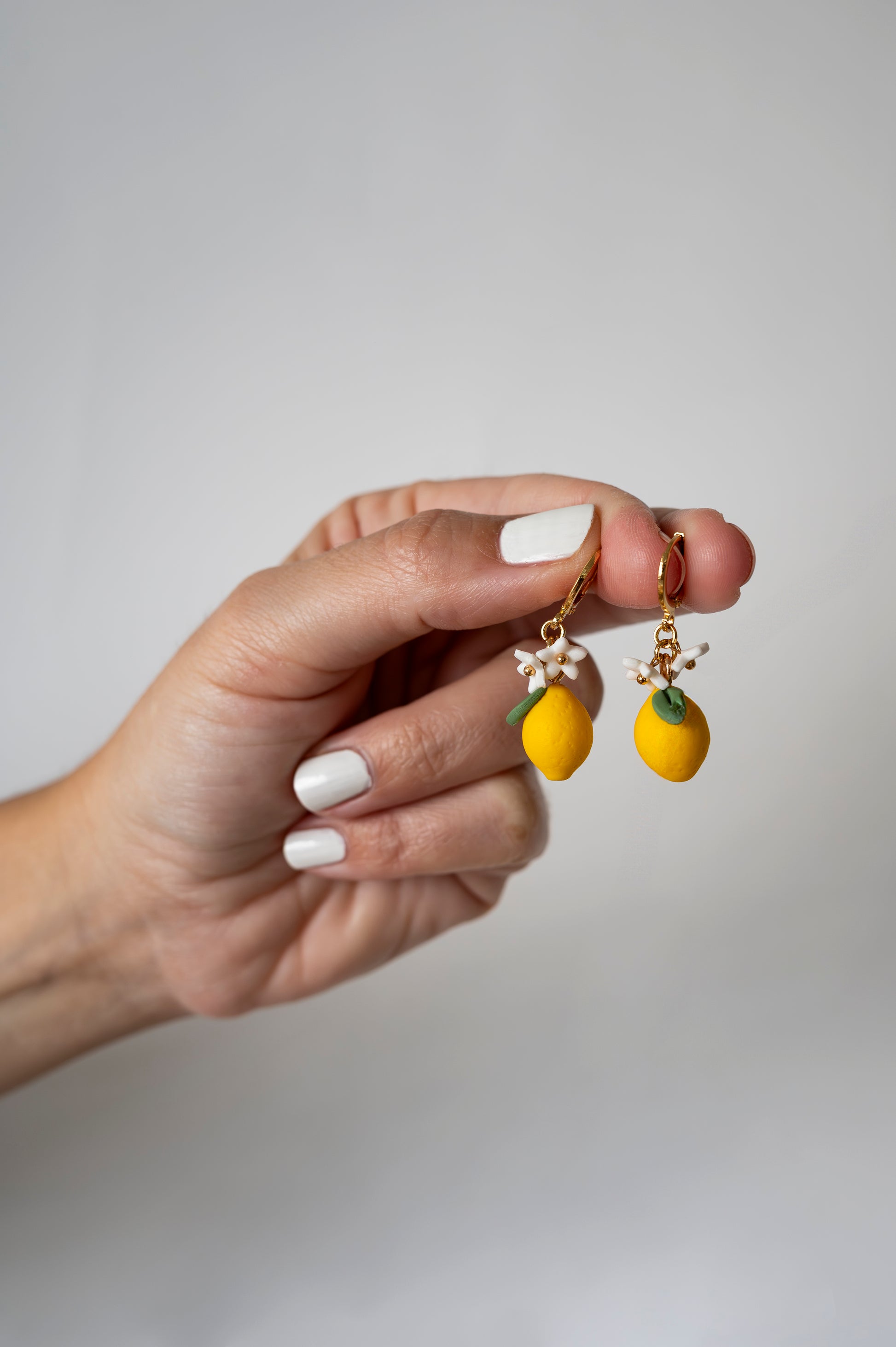 Esta colección de limones y flores de azahar capturan la esencia de la huerta de Murcia. Cada pieza está hecha a mano con arcilla polimérica y está compuesto por un limón y dos flores de azahar. Los aros son de latón bañados en oro de 18 K y la cadena es de acero inoxidable bañado en oro.